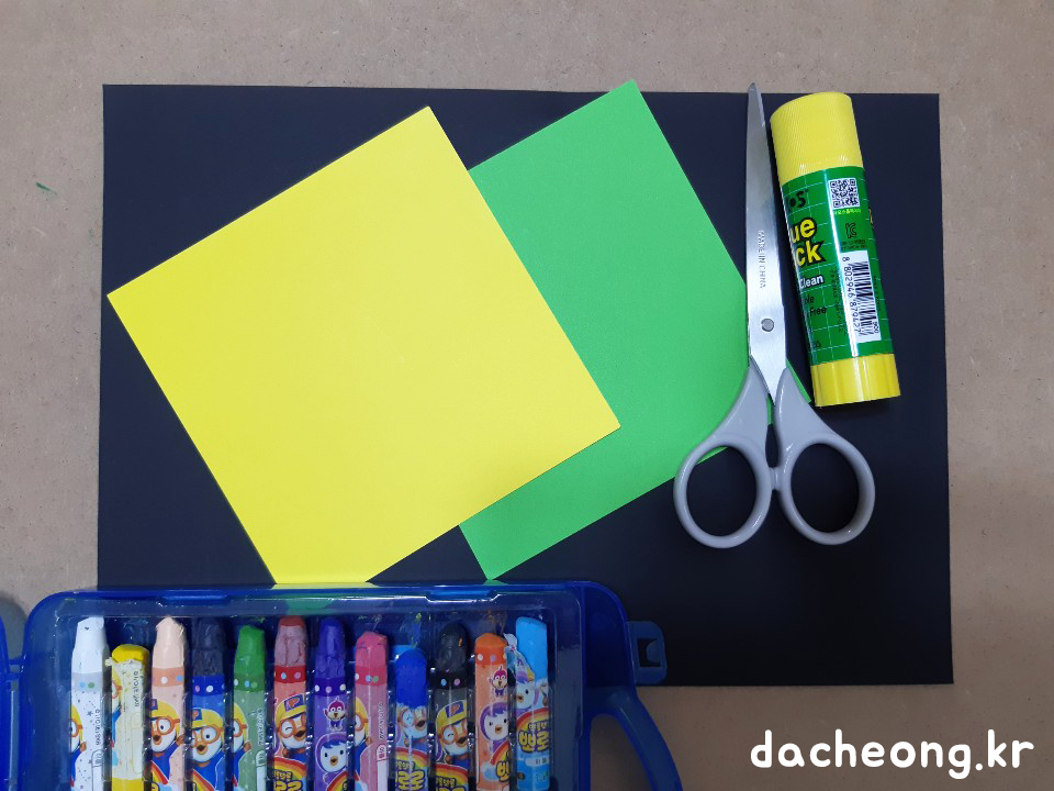 ①팬시페이퍼(검은색), 색종이(노란색, 녹색), 가위, 풀, 크레파스 등을 준비한다.
