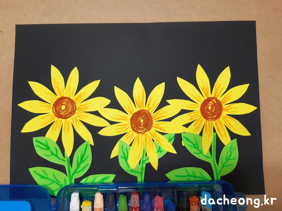 ④검은색 팬시페이퍼에 오린 색종이로 해바라기 모양을 자유롭게 꾸민다.