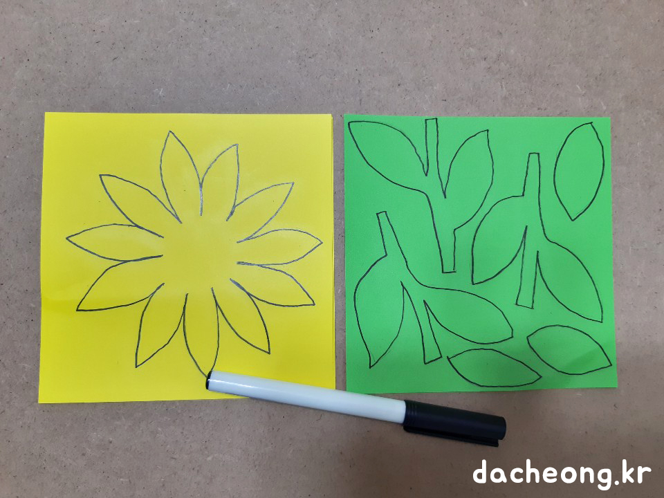 ②색종이에 꽃과 잎을 그려준다.