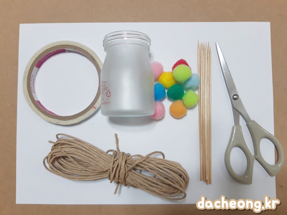 재료: 줄끈, 퐁퐁이(칼라), 양면테이프, 가위, 리드 스틱(나무꼬치), 병(재활용)