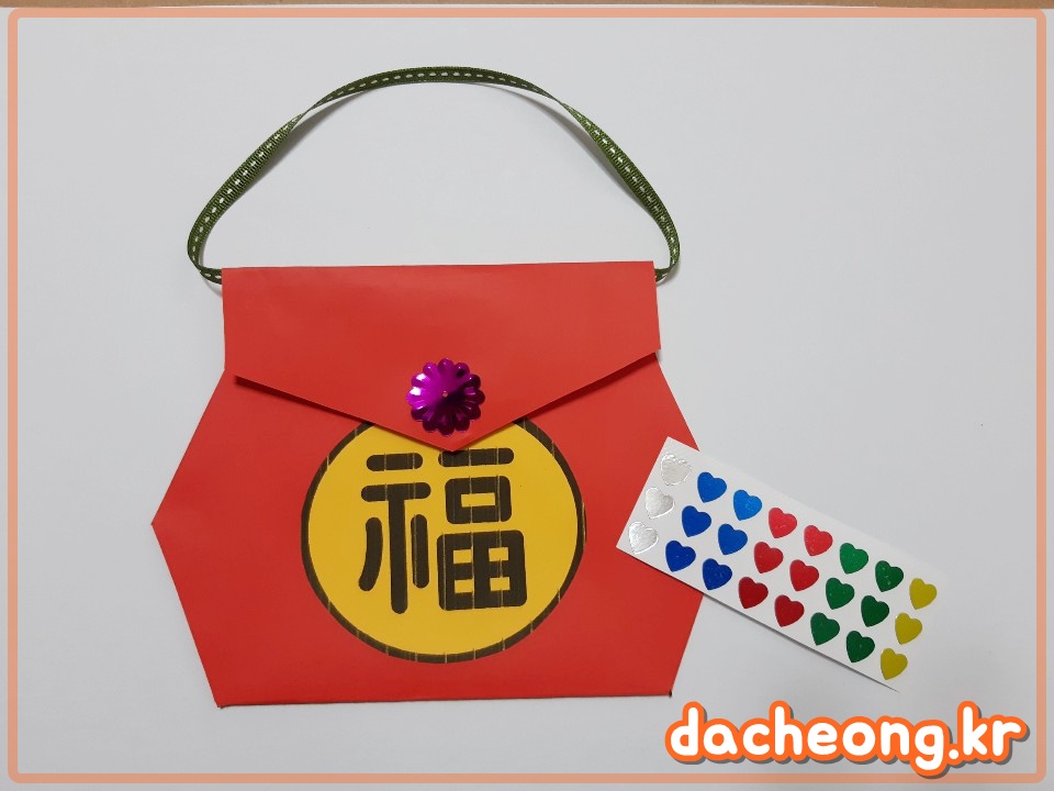 준비물: 복 주머니 전개도, 복자 도안지, 스팽글, 줄끈, 스티커, 딱풀
