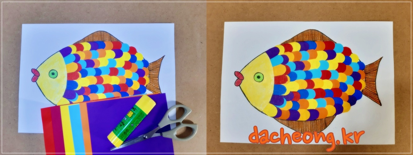 어르신들에게 금붕어 도안을 나눠드리고 색칠만 원하시면 색칠만 하시고 색종이를 꾸미고 싶으신 분은 색종이를 오려 붙이시라고 했습니다.