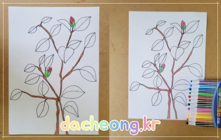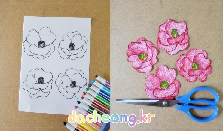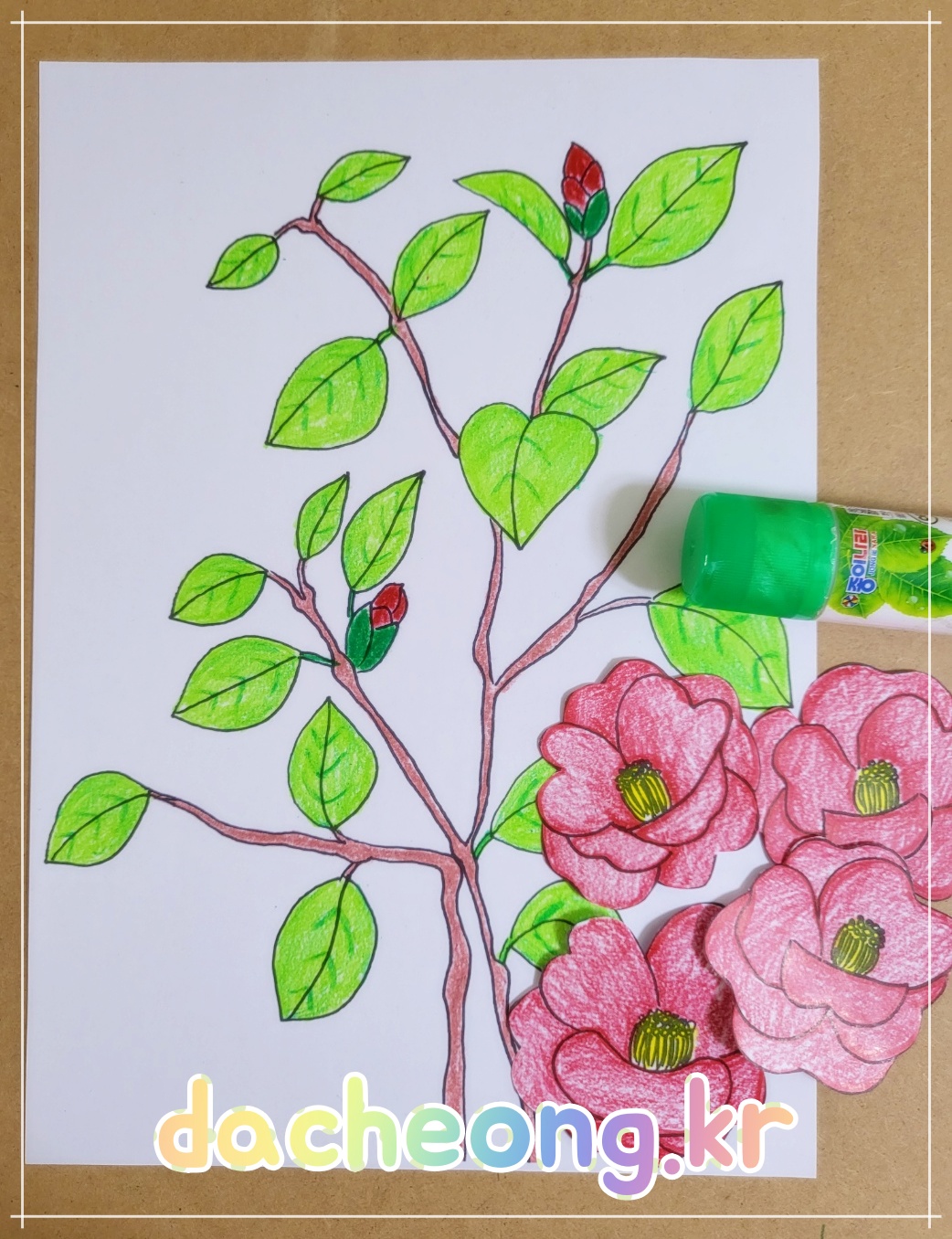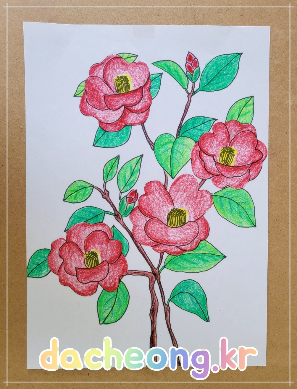 어르신들과 동백꽃에 대해 이야기 나누고 동백꽃에 대한 추억도 회상해 보면서 동백꽃잎에 색칠해 보았습니다.