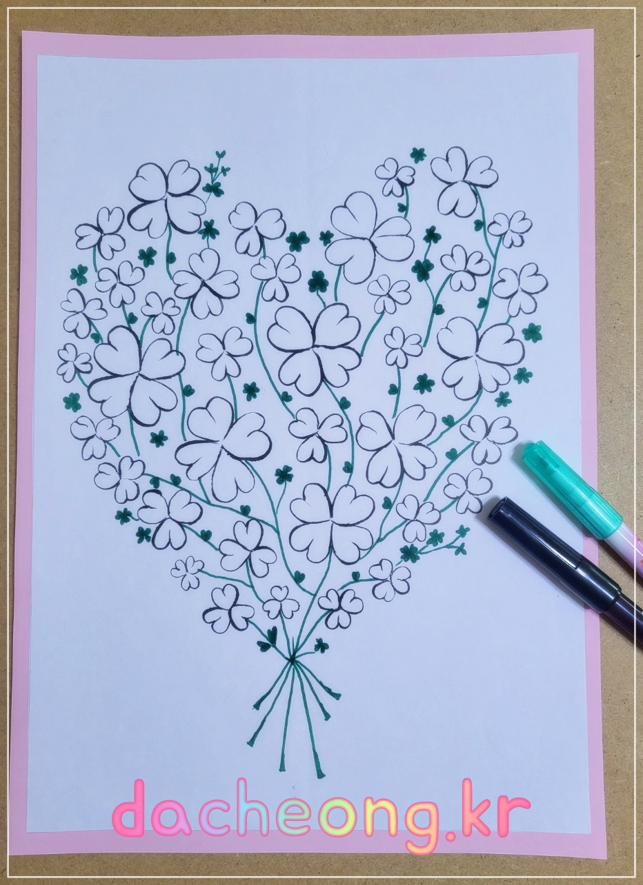 어르신들과 네잎 클로버에 대해 이야기를 나눈 다음 클로버 도안에 색연필로 색칠을 하고 반짝이 스티커도 붙여보았답니다. 즐겁게 활동을 하시는 어르신들 모습 속에서 행복이라는 단어가 가슴속에 와닿았습니다.