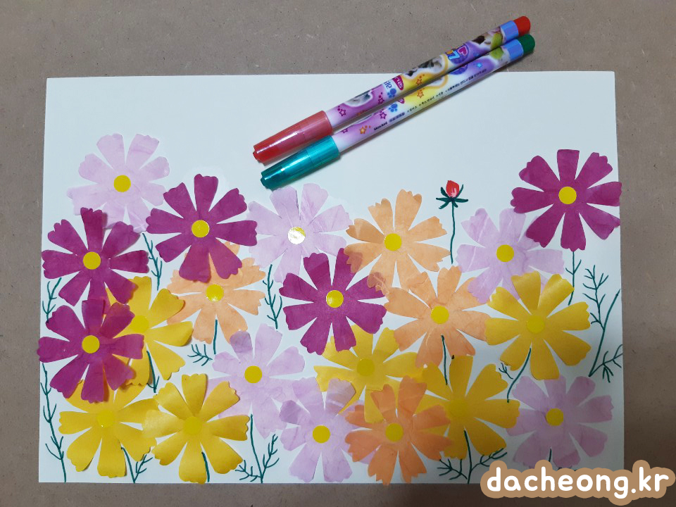 어르신들은 꽃을 좋아하시지요. 한지로 꾸미는 코스모스는 어르신들의 기억력을 활성화시키고 여러 색을