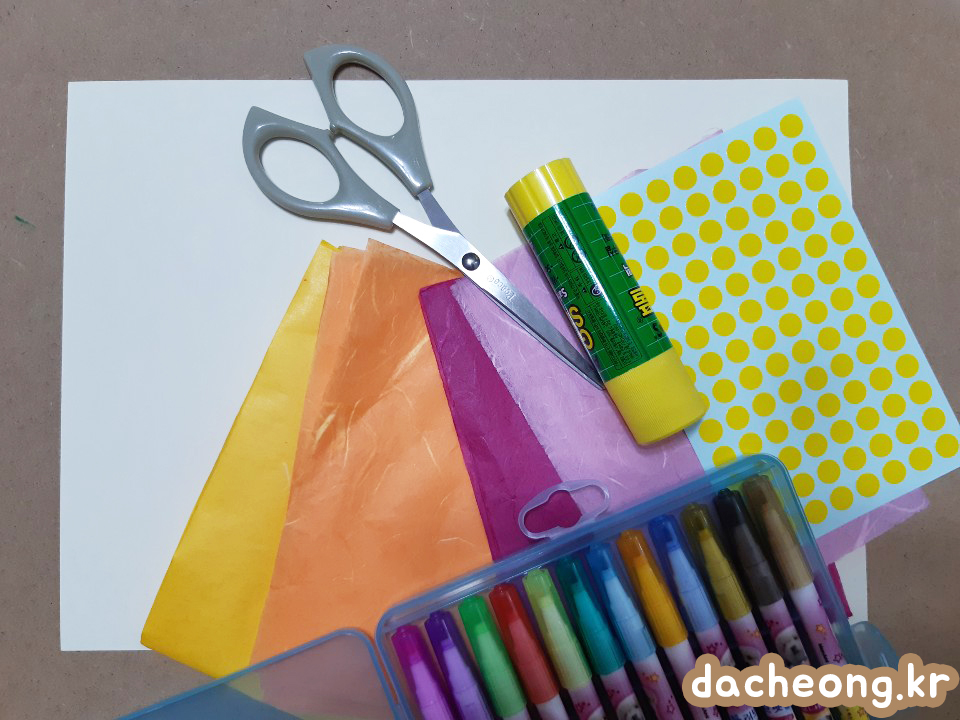 ①준비물: 한지, 스티커, 팬시 페이퍼, 딱풀, 가위, 사인펜