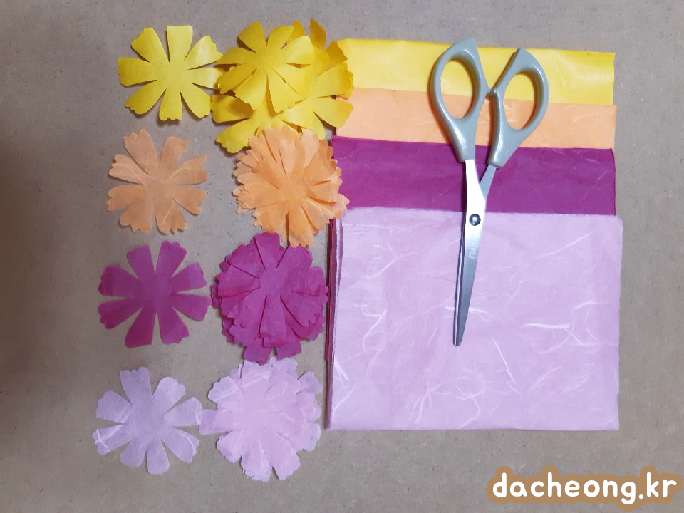 ②가위로 한지를 코스모스 모양으로 자른다.
